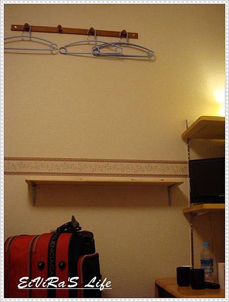 牆上有層板,可以放一些哩哩扣扣的,上面還有衣架,可以掛衣服