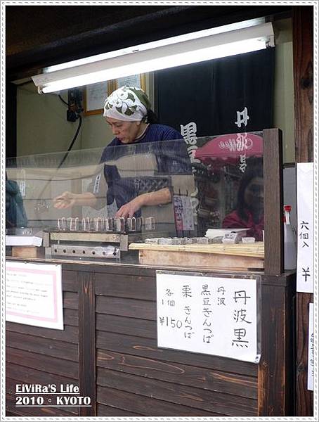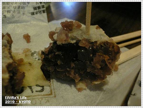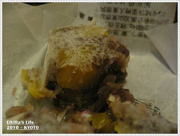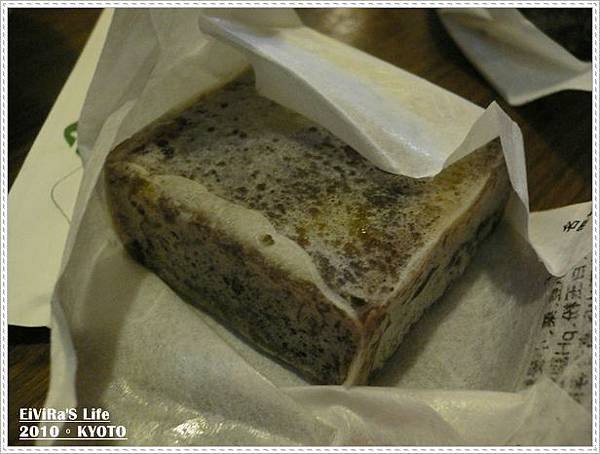きんつば也是和菓子的一種,丹波的きんつば,使用丹波大納言小豆和丹波黒大豆來做成中間豆泥的部份,並把它塑成方形,沾上麵粉漿後,在鐵皮上稍微煎過後,和一般看到圓形且具美感的和菓子不太一樣,外皮包覆了一層薄薄的麵粉皮,但重點是內層那厚實的豆沙泥,並不會很甜,所以即使沒有搭配著茶,也覺得相當好吃。[別人部落格寫的]