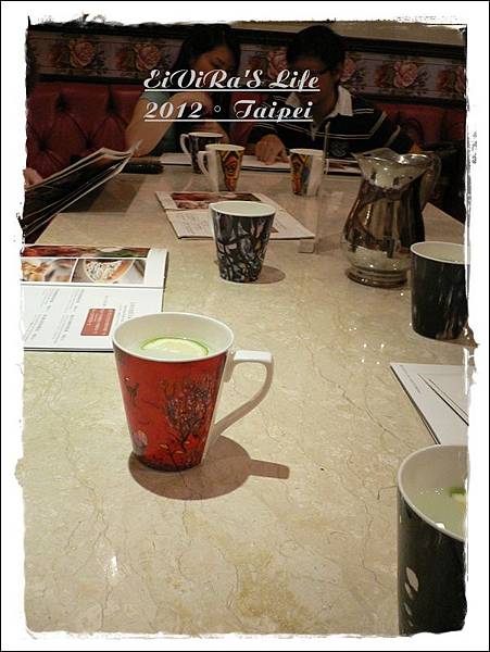 水杯是用馬克杯裝,上面都有不同的圖案,水裡加上了檸檬片,喝起來很清爽
